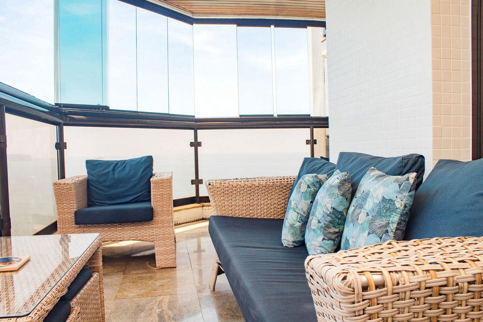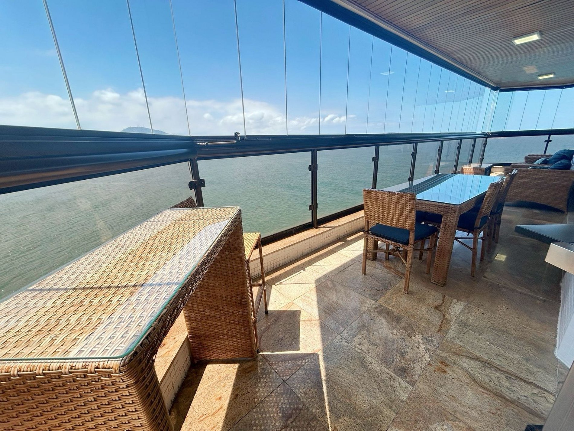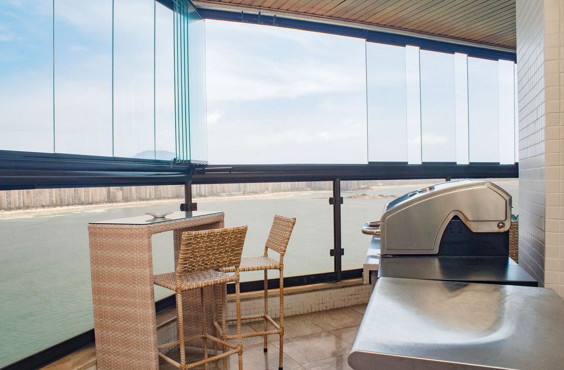 varanda gourmet com churrasqueira a gás e vista para o mar