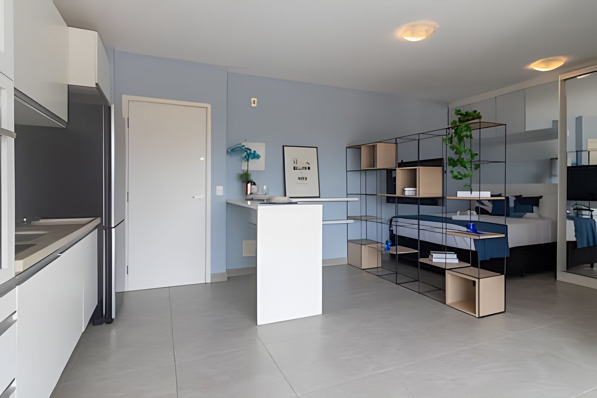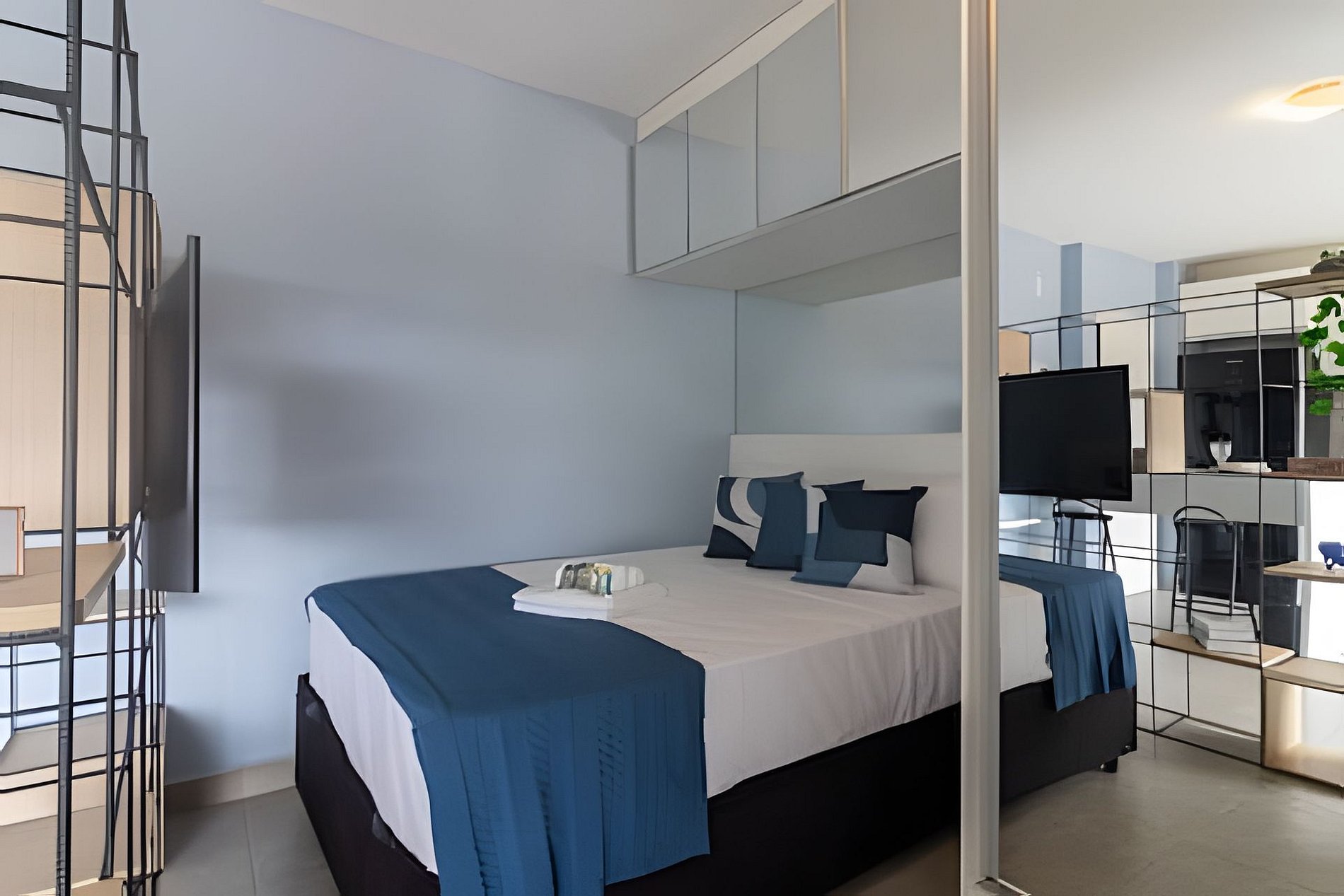 Studio Lineup Campo Belo: 4• Andar Ideal para 3 pessoas Fornecemos amenities: Shampoo 2x1, Sabonete e escova de dente com creme dental. Studio amplo com cozinha equipada com: geladeira forno elétrico micro-ondas sanduicheira liquidificador fogão cooktop Quarto: 1 cama casal 1 Puff solteiro tv 431 com streamings internet e wi-fi (fibra ótica) sala de estar: cafeteira nespresso jogo de xícaras 2 poltronas para apreciar a vista mesa e cadeira para trabalho ou estudos Banheiro: 1 banheiro